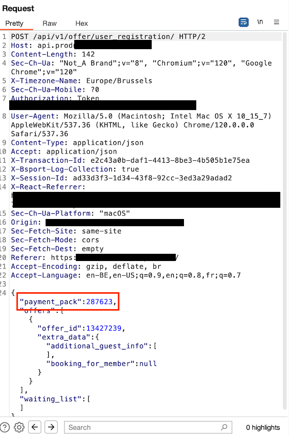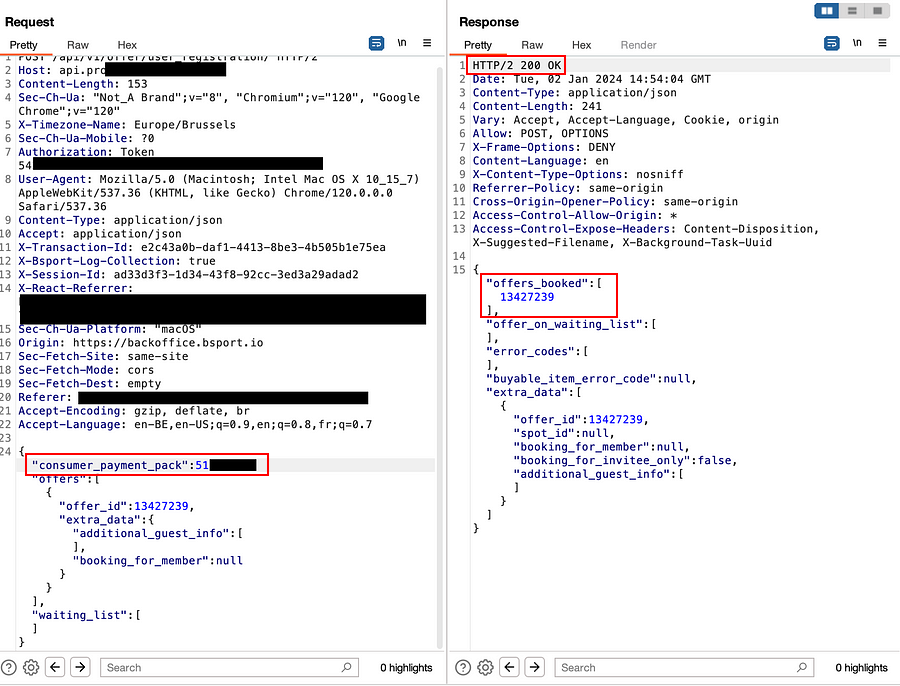 As you can see on image 2, I was able to book a class using the payment pack ID of another account. The validation is shown by the “offers_booked” parameter in the response body. Disclaimer: for testing purposes, I had created a separate account.