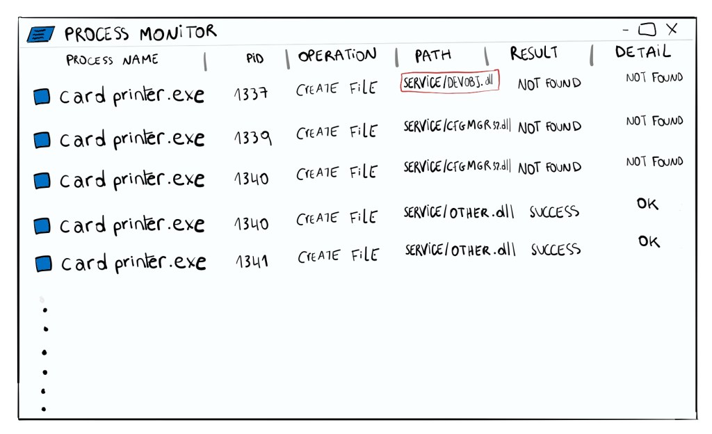 By analyzing the behaviour of the card printer software, I noticed that the software was attempting to load DLLs (dynamic-link library is a shared library in the Microsoft Windows operating system) that did not exist. The software, which runs under SYSTEM context (high privileges), will invoke the DEVOBJ.dll or CFGMGR32.dll in the folder “C:\ProgramData\Datacard\<CardPrinterSoftware>\Service” and respond with a NOT FOUND by the application installer.