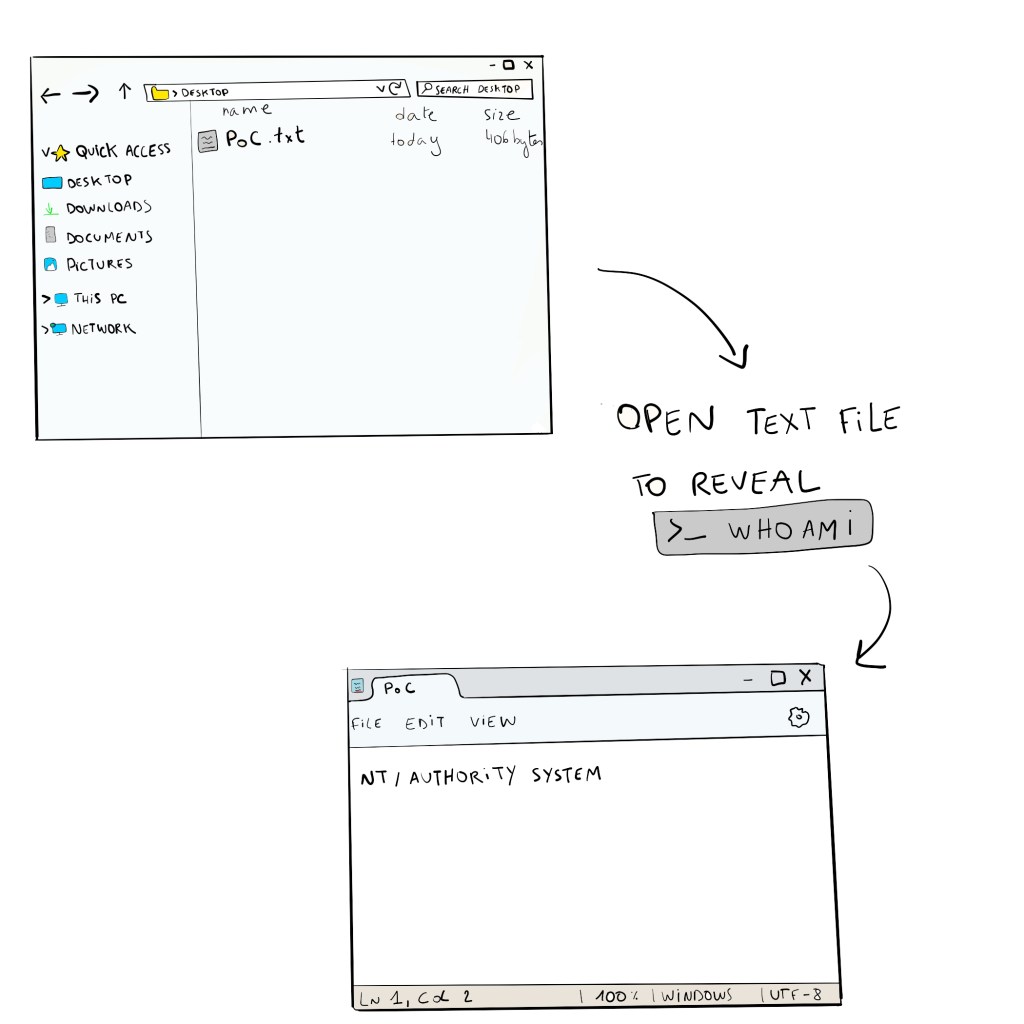 After my malicious DLL is loaded, we can indeed find a PoC.txt file that was created in the desktop folder. Opening the file reveals that the whoami command was indeed executed by SYSTEM.