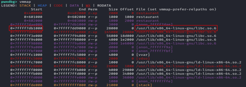 To get the base address of libc, we can run vmmap in pwndbg. The base of libc will be the first address you’ll see when you look for libc.so.6 (where I framed it in red).