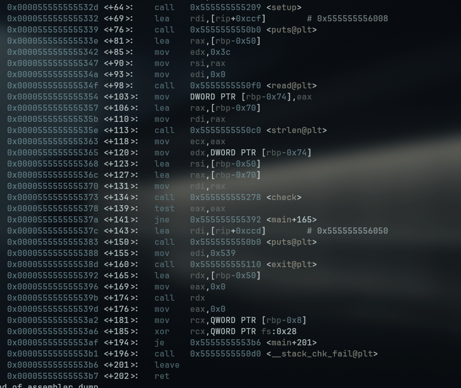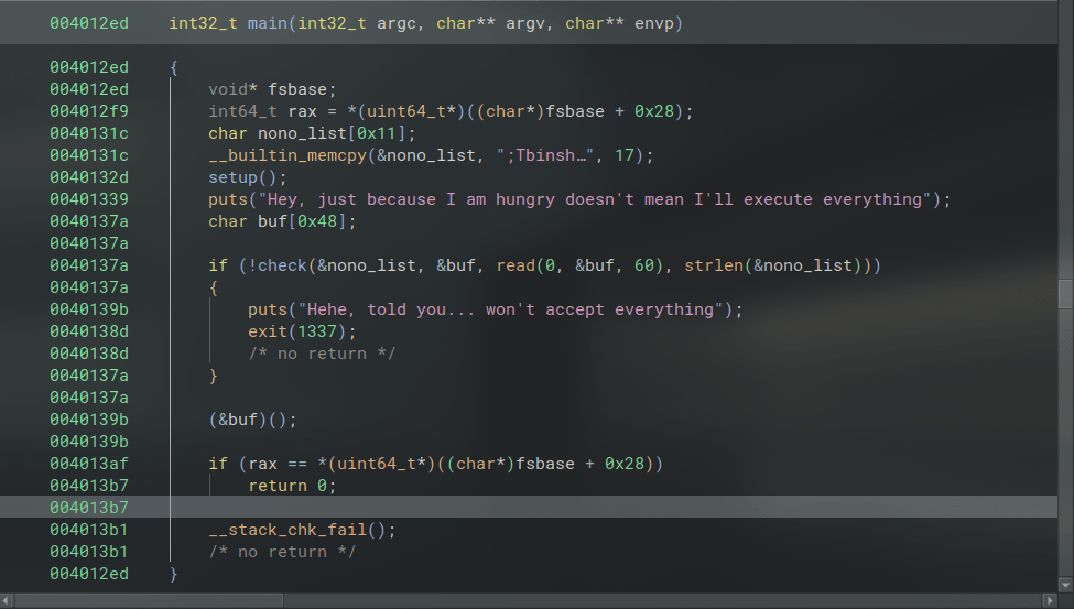 In the below screenshot, notice that the program performs check() on our input, and if we pass the check then it will execute our buf array (thanks to the (&buf)() function pointer).