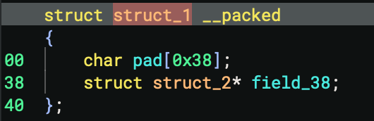 We add padding until offset 0x38, because we don’t know yet what will reside in this struct, but we do know that at offset 0x38 we have a pointer to another struct.