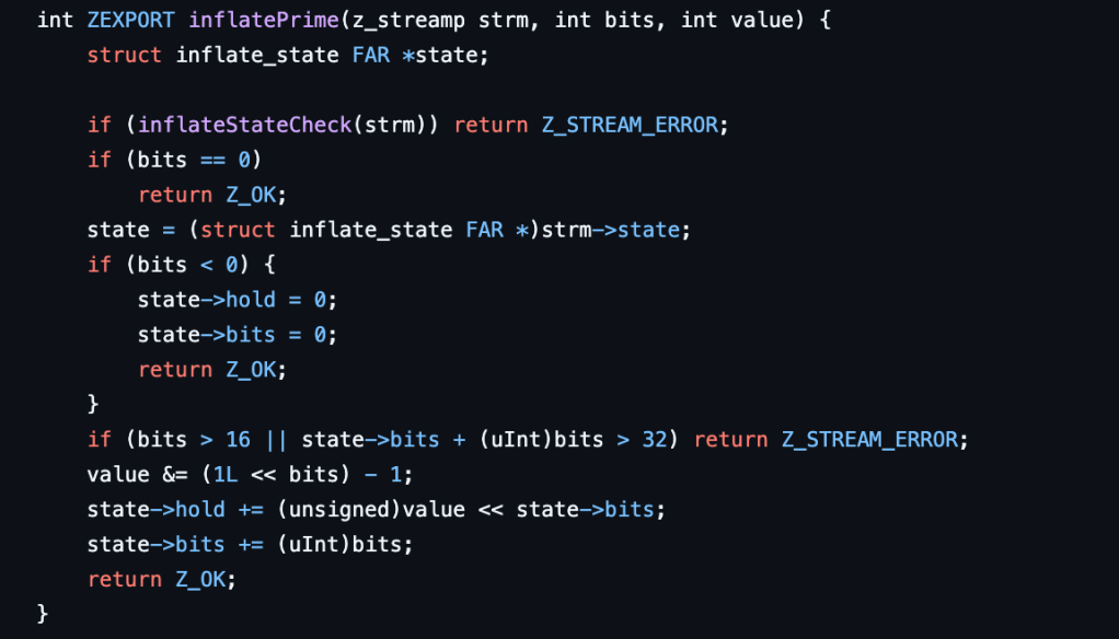 I chose (randomly) the inflatePrime function from the inflate.c file. The structure definitions are going to be in the inflate.h header file.