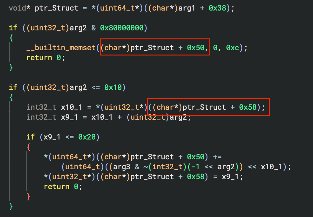 Additionally, compilers refer to fields inside structs using fixed offsets after layout is decided. If we keep reading the code, we also notice how there are multiple consistent offsets (0x38, 0x50, 0x58), which could also suggest a defined memory layout, just like struct members.