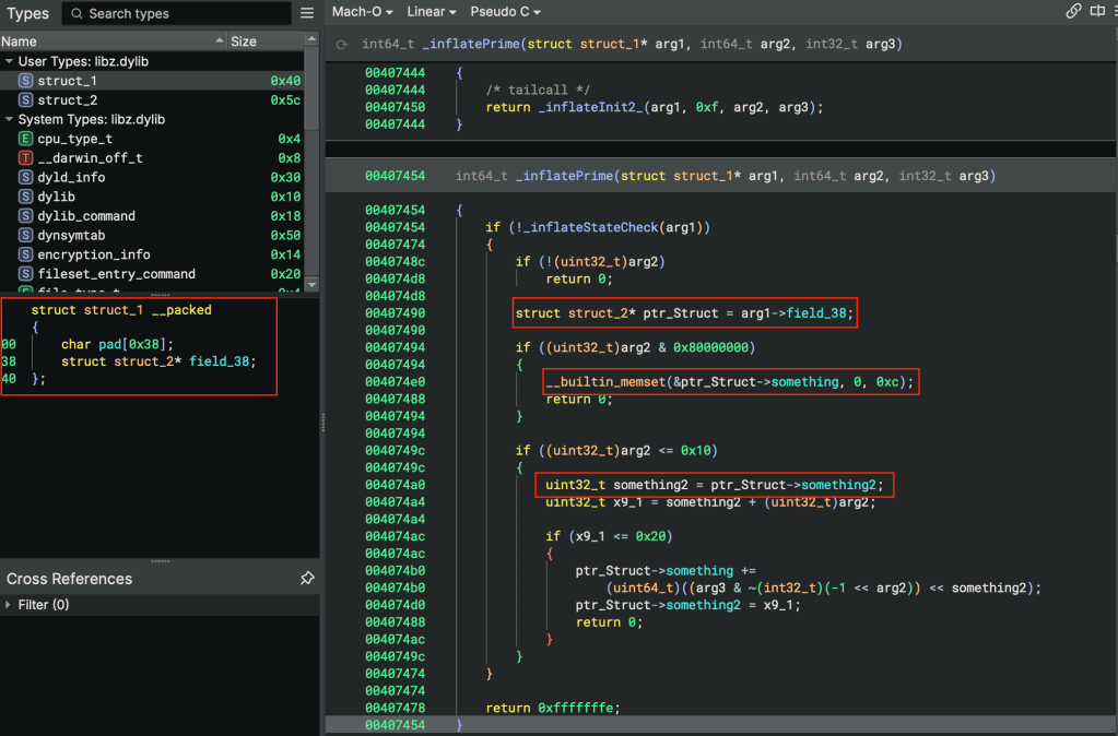 By comparing our decompiled code, we notice z_streamp strm as our arg1, which in the zlib manual is a pointer to struct z_stream_s.