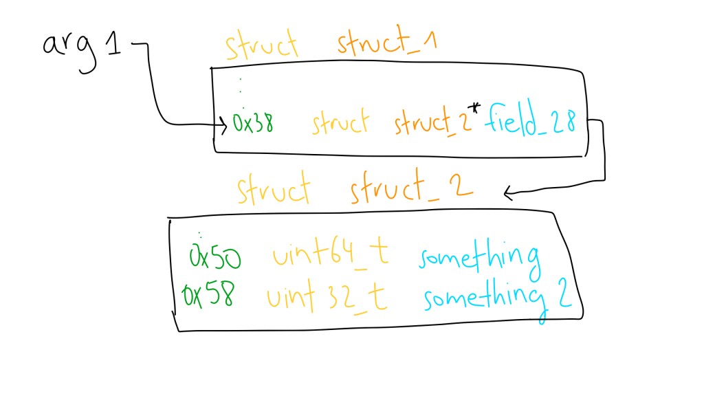 Here is a visual layout showing how arg1 at offset 0x38 contains another pointer to struct_2.