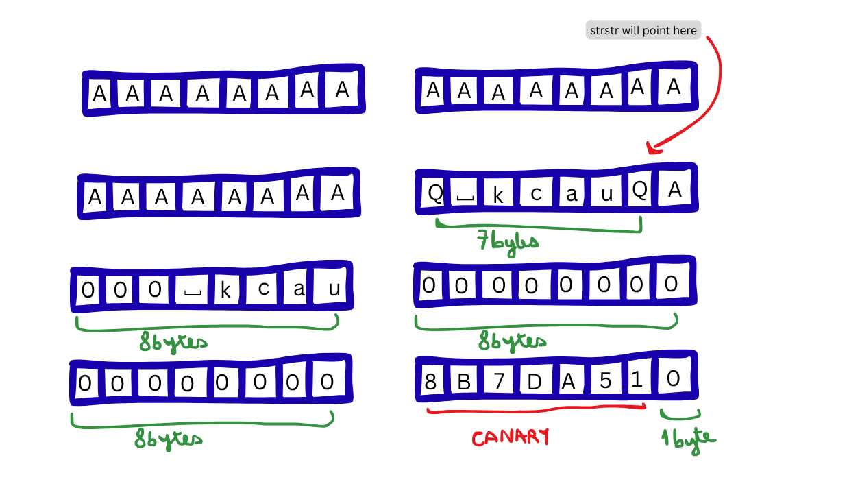 This is where we will be able to leak the canary. Basically, we can ensure to have our strstr pointer point right next to the value of the canary (in memory). Once we have that set-up, we will start reading as of rax_1[0x20] (rax_1[32]).