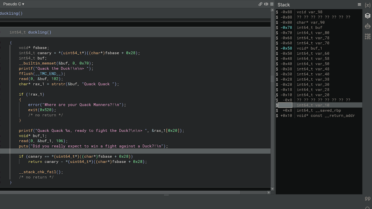 For the second vulnerability, we have a classic stack buffer overflow where we can overwrite the return address to the duck_attack function, which will print the flag. This is called a ret2win.