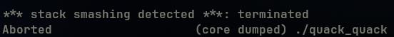 Analysing the code, we see that we are required to enter up to 0x66 (102) bytes into buf. Then, it’s performing a string search of the string “Quack Quack ” in all of our input. That means we can write AAAAQuack Quack AAA and we will satisfy the if condition.