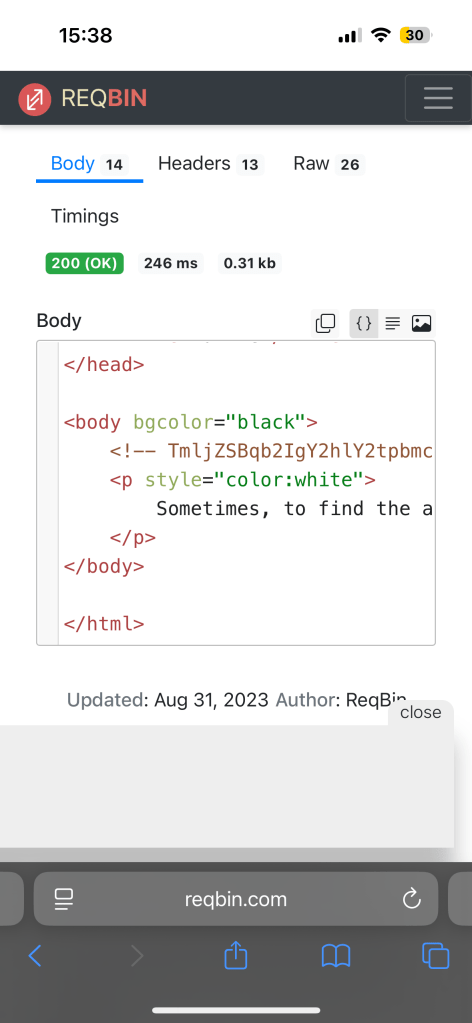 The puzzle started out with a URL. The page had one line of cryptic text, and with a little of web CTF experience, I knew the interesting information was going to be in the website’s HTML code. Being on Safari, I couldn’t get/figure out how to view the HTML source code of a website, so instead I used an online cURL website, and I found what looked like a base64 encoded comment.