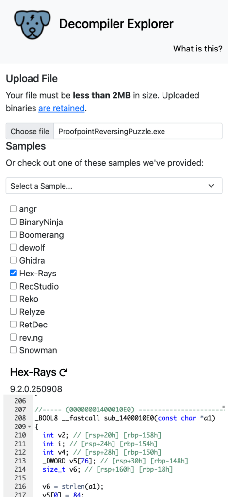I consulted some of my friends for this, and one suggested Binary Ninja Cloud (good option), and someone else suggested dogbolt.com. The latter one was perfect because the file size was small enough, and I could chose which decompiler I wanted.